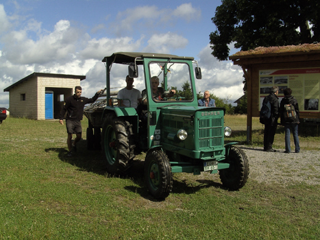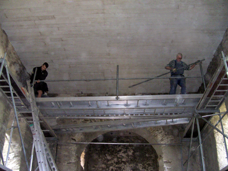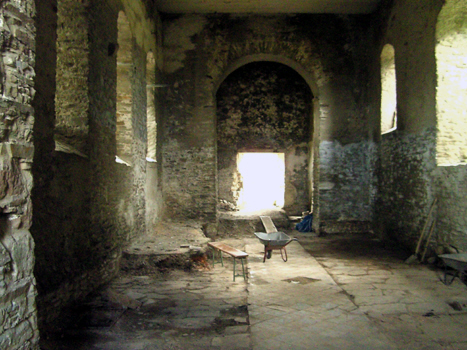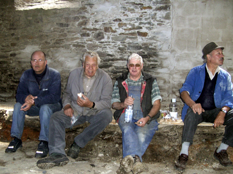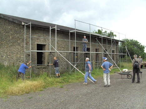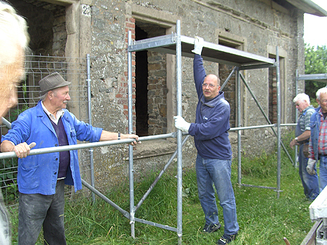 das Gerüst wird von der Kirche zur Ruine der Dorfschule transportiert