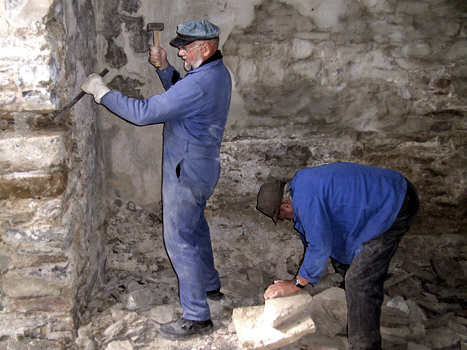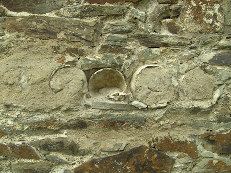 in der Südmauer der Kirche wurden bei den Instandsetzungsarbeiten vier eingebaute Schädel vorgefunden. Da die alten Gräber rund um die Kirche noch vorhanden sind ist anzunehmen, dass diese "makabere Dekoration" während der militärischen Nutzung vorgenommen wurde.