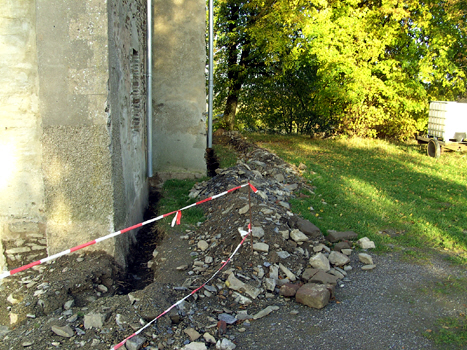 Entlang der Kirchenaußenmauer wird zurzeit eine Drainage angelegt um zu verhindern, dass Wasser in die Kirche eindringen kann