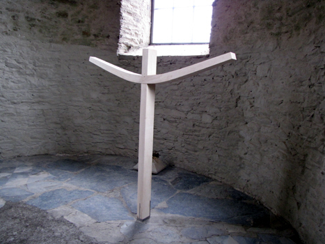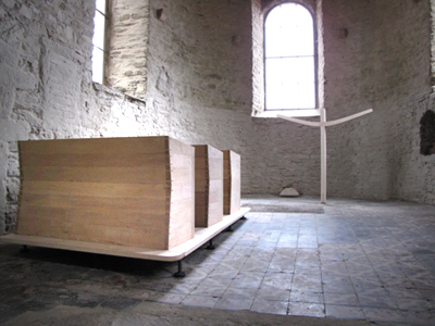 Kirchenbänke und Auferstehungskreuz