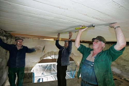 Derzeit sind die schwindelfreien Mitglieder damit beschäftigt, das Kirchendach im Innenbereich nach den Vorgaben des Denkmalamtes mit Brettern zu schließen. Außerdem dichten sie von innen das Gesims ab.